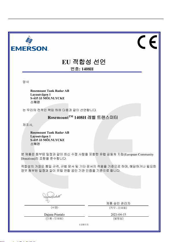 적합성 선언의 최신 개정판은 Emerson.com/Rosemount에서 찾을 수