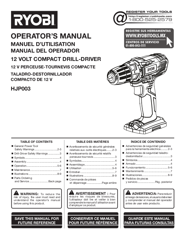 Visiter www.ryobitools.com ou en téléphonant au 1-800-525-2579