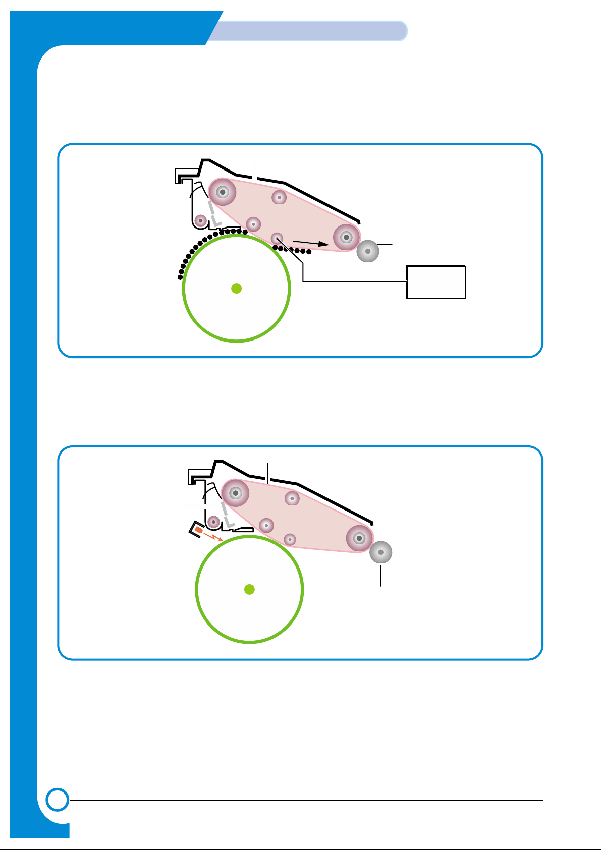 image on OPC drum -> Supplies toner on OPC drum -> Transfers image to ITB (T1 ) -> Pickups a