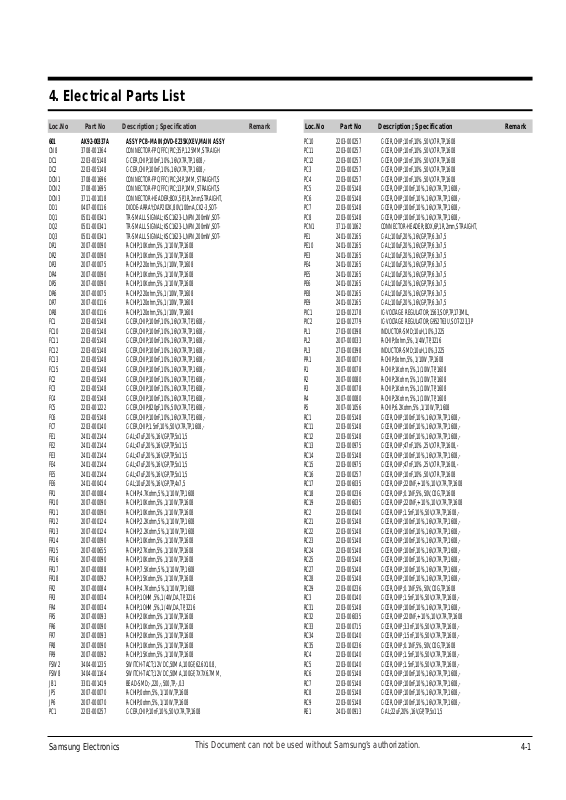Loc.No Part No Description ; Specification Remark Loc.No Part No Description ; Specification Remark