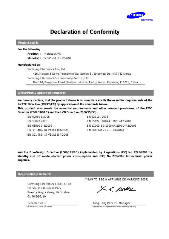 EN 301 489- 01 V1.8.1 (04-2008) EN 300 328 V1.7.1 (10-2006)