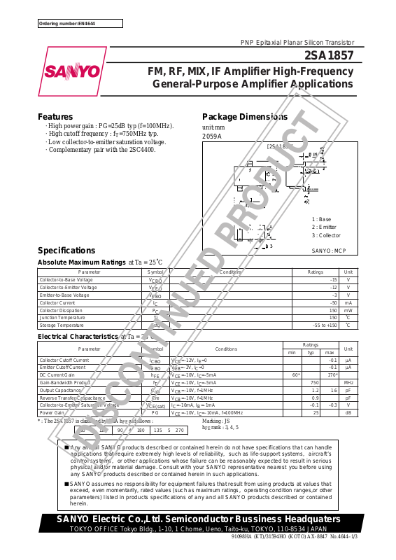 * : The 2SA1857 is classified by 5mA hFE as follows : Marking : JS