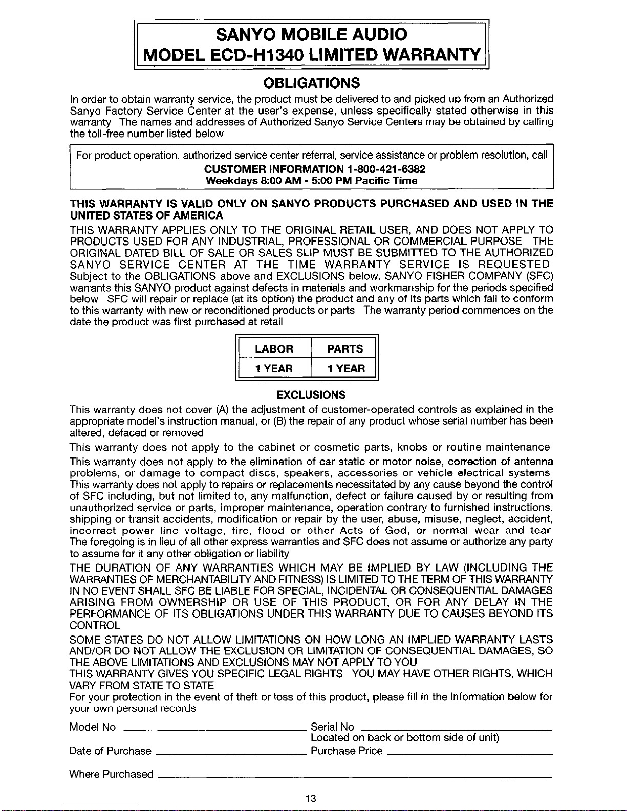 Subject to the OBLIGATIONS above and EXCLUSIONS below, SANYO FISHER COMPANY (SFC)