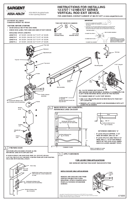 FOR ASSISTANCE, CONTACT SARGENT AT 800-727-5477 or www.sargentlock.com