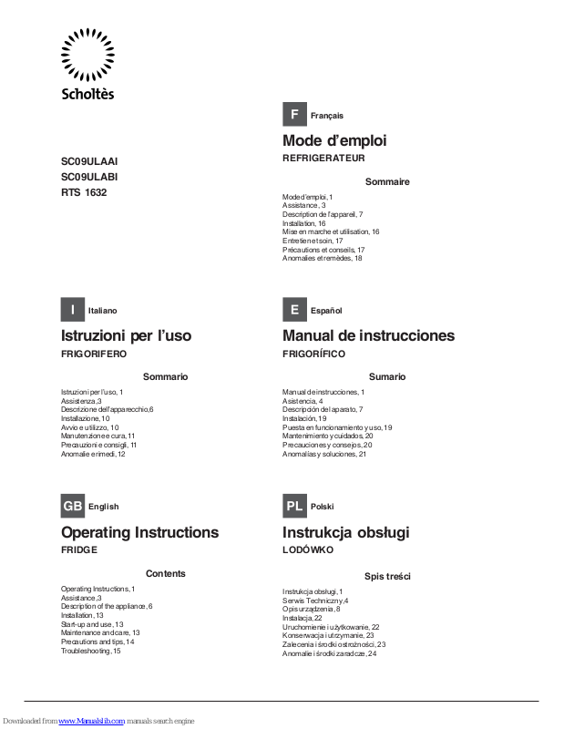 SCHOLTES SC09ULABI, RTS 1632 Operating Instructions Manual