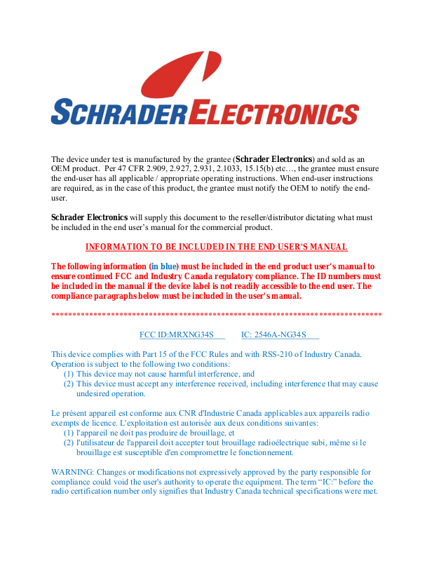 Schrader Electronics will supply this document to the reseller/distributor dictating what must