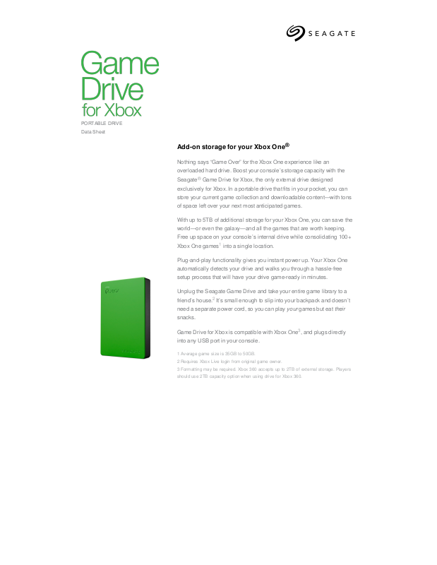 1 Formatting ma y be required. X box 360 ac cepts up to 2TB of external storage. Pl ayers sho uld use 2 TB capaci ty option when using drive for Xbox 360.