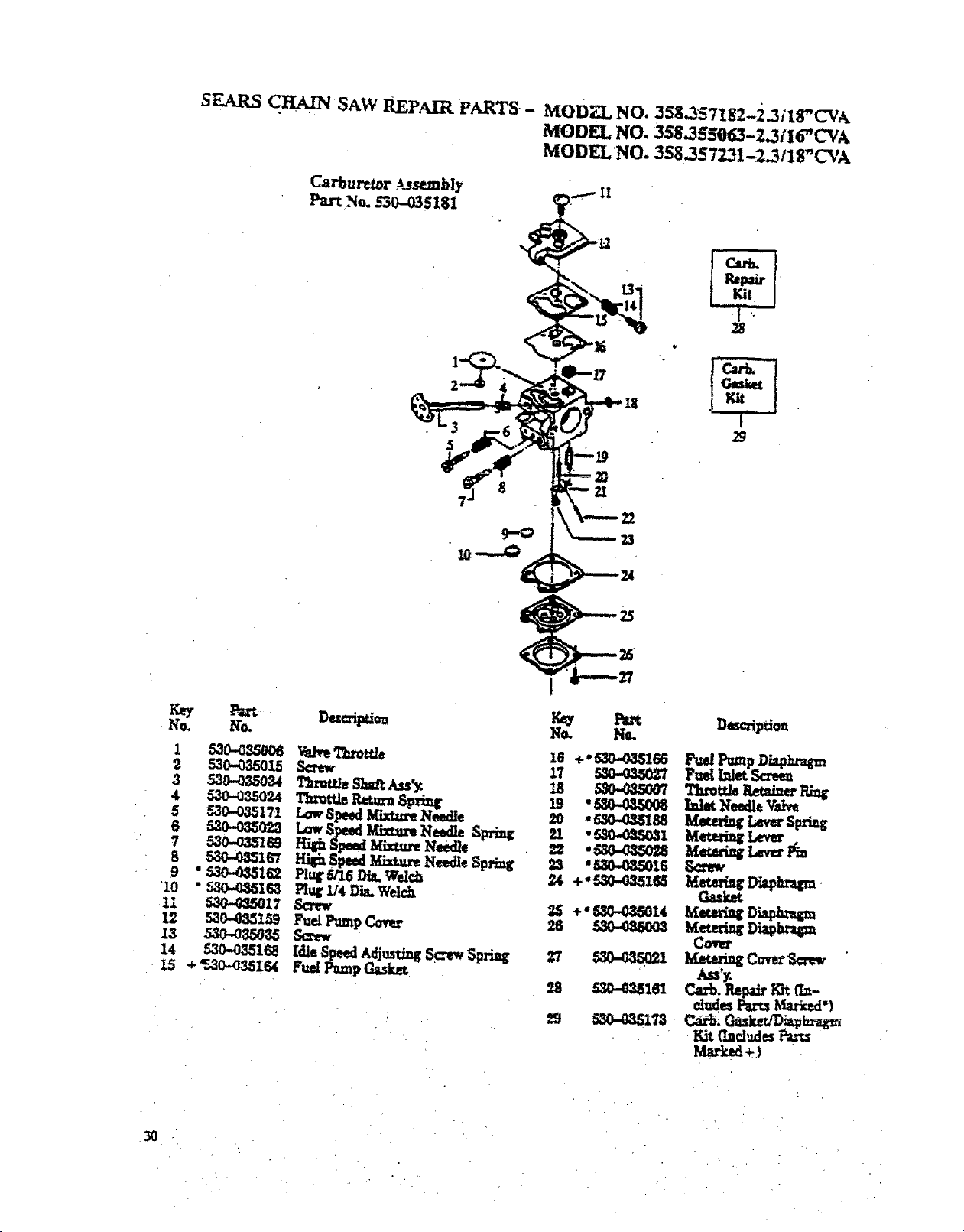 SEARS CHAIN SAW REPA£R PARTS- MODZL NO. 358..357182-2.3118"C'VA.