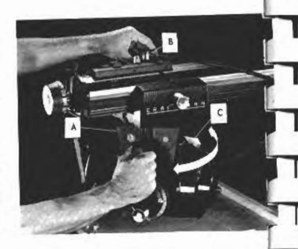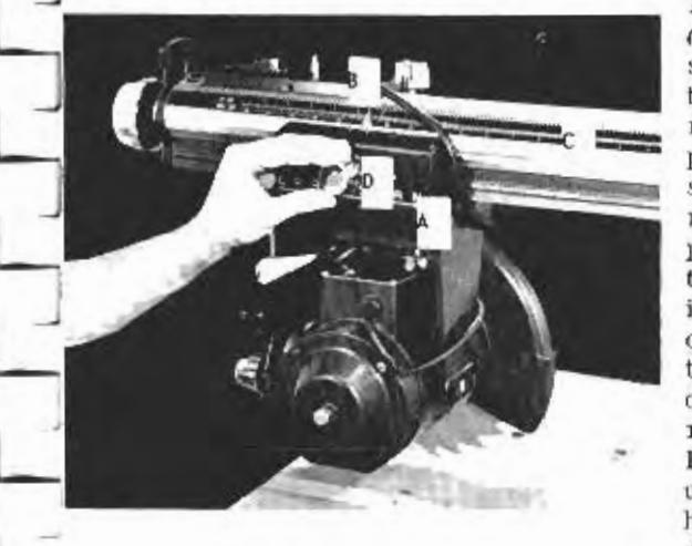 The Carriage (A) is positioned by manually gliding it along the arm - to any desired position indicated by a Pointer (B) with reference to a Scale (C). There are two scales on right side, one to show "Out-Rip", the other to show "In-Rip" blade position with respect to the fence at its normal position. A single scale on left side shows "Out-Rip" blade position with respect to the fence at its rearmost position. If a fixed position is desired the carriage must be locked to eliminate play - by clockwise tightening this knob loose, however, if your operation requires traveling the carriage along the arm . but never leave it loose with motor running unless you are holding the carriage handle. Knob and pointers are coded