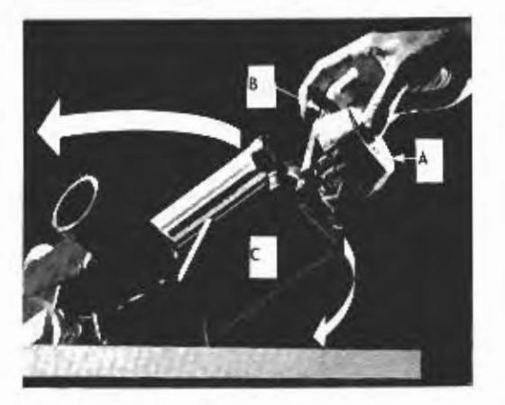 The Power Unit Yoke (A) can be manually swiveled on the carriage more than 180° clockwise or counterclockwise from normal (blade aligned with arm) position. There are six indexed positions: 00, 450 and 900 right, 45° and 90° left, and 180°. The voke stops at each position unless the Swivel Latch Knob (B) is held lifted up. In any position - even the index positions - the voke must be locked to eliminate play - by pushing the Yoke Clamp Handle (C) tightly toward the column. Pulling the handle toward you loosens the yoke. Yoke, latch and handle are coded orange.