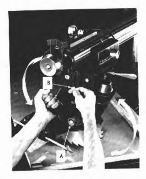The Power Unit can be manually pivoted 180° in either direction in the yoke. Rotation is, however, limited by the guard or by any accessory mounted at either motor-shaft end. Pivoting is indexed at five positions: 1) Accessory Shaft at 90° (vertical and at bottom); 2) Accessory Shaft at 45° (to the right from 90°); 3) Both the Accessory Shaft and the Saw Shaft at 0° (horizontal - which places the saw blade vertical); 4) Saw Shaft at 45° (down from 0°); 5) Saw Shaft at 900 (at bottom, with blade horizontal). Positions 1 and 2 can be reached only with the saw blade and guard removed; positions 4 and 5 can be reached only when nothing is mounted at the accessory shaft end. To avoid or to release from an index position hold the Bevel Index Latch (B) up while pivoting. In any position - even an index position - the unit must be locked to eliminate play. To lock, tighten (clockwise) the Bevel Lock Knob (A), which must be loosened for repositioning. A Scale (behind knob) with a Pointer indicates in degrees the blade bevel-angle setting. Latch, knob and pointer are coded yellow.