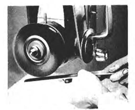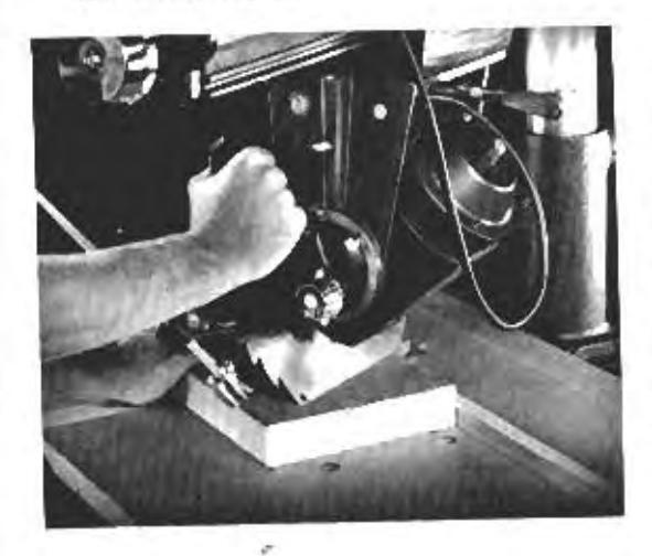 A convenient Elevating Crank raises or lowers the Arm, Carriage and Power Unit – exactly 1/16 in. for each half revolution of the crank. Maximum travel is 8-1/8 in. No lock is needed; the parts remain at any height to which adjusted. Crank and top-front of Column are coded blue .