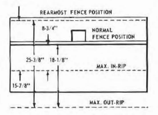 Blade - 10" x 5/8" hole Table - 26-1 8" x 36 ", laminated hardboard Scales - Miter, bevel, In- and out-rip Arm Rotation - 360° Miter Stops - 0° and 45° R and L Yoke Swivel - 180° R and L Yoke Stops - 0°, 45°, and 90° R and L Power Unit Tilt - 180° Bevel Stops - 0°, 45°, and 90° R and L Depth of Cut - 2-1/2" vert, or 2-1/8" at 45° Width of Rip - 25-3/8" max. Width, Crosscut - 15-1/2" max.
