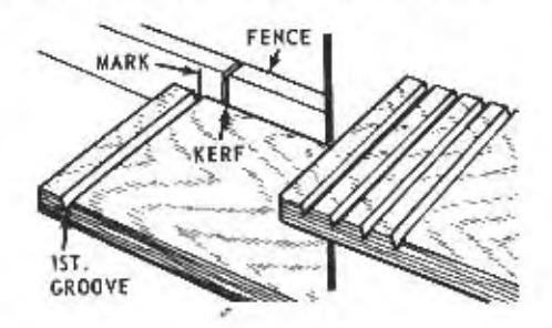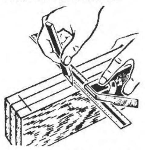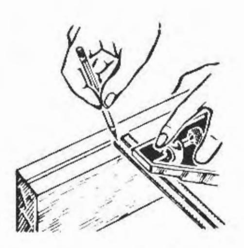 or a scratch awl. Preferably keep all lines thin (to avoid the inaccuracy of a varying thickness line), and do marking for a saw cut so that you can saw along one side of the line and the saw kerf will be in the waste material (rather than in or partly in the piece to be used). Use the combination square to mark a line parallel to an edge, or to draw a line at a right angle to an edge.