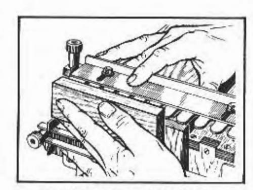 the scale standing upright alongside of the gage. Adjust the gage until its scriber point touches the scale at a height equal to the measurement desired. Now set the workpiece adjacent to the gage with the surface to be marked vertical and facing the gage — and scribe your mark on it with the pre-set scriber point. By similarly measuring other distances up from the bottom workpiece edge, any number of points with desired distances between can be located.