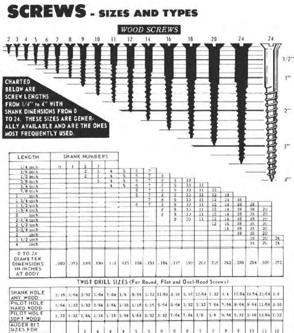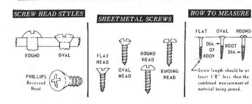 Wood screws though more trouble to use than nails, are preferable to nails for most cabinetwork. With a little care they make a neater joint and neater appearance: will "draw" a joint tighter - and hold better and longer. They are sold in sizes measured according to diameter and length Lengths are stated in inches and/or fractions thereof: diameters are stated by code numbers, the smallest being "No O" and the largest you are likely to use being "No. 24." Common sizes and types are shown on the chart in this chapter. Flathead types are measured (for length) from tin to ton of head; oval-head types are measured from tip to the edge of the head; and the round- and fillister-head types are measured from the tip to the underside of the head.