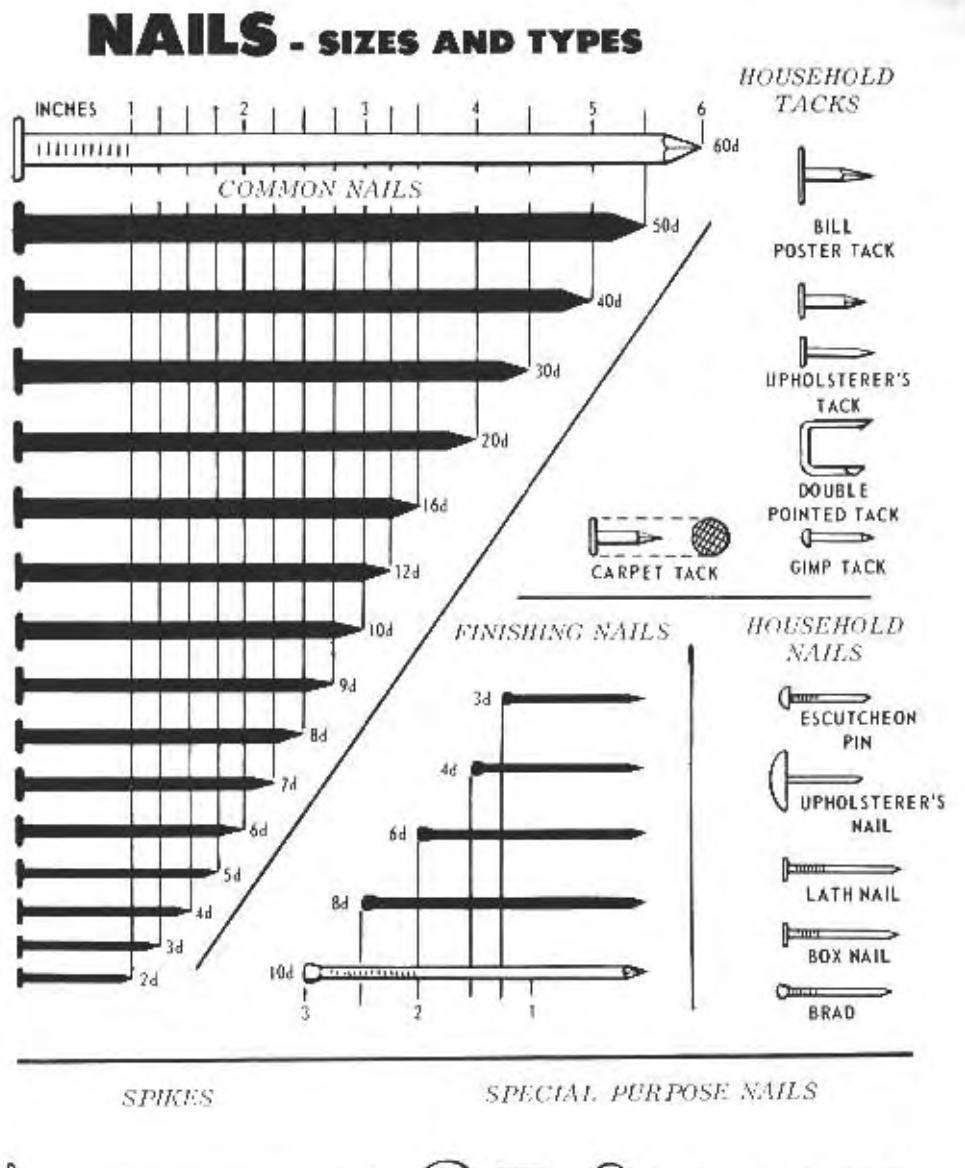 The charts accompanying this chapter show the lengths, diameter and head sizes of the various types of nails in general use for cabinet and other woodworking projects.