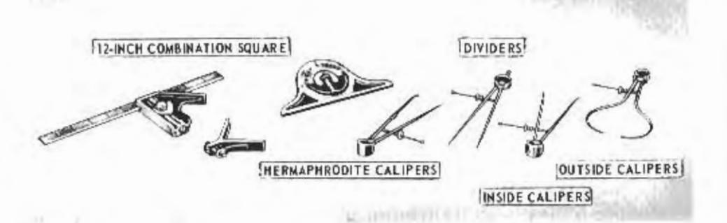 Accurate dimensions can be transferred from your plan or blueprint to a workpiece by use of dividers or a surface gage. Hermaphrodite calipers are useful when measuring infrom the edge of a workpiece; while inside and outside calibers are used to take dimensions between lines or surfaces requiring inside or outside points of contact, respectively. If working to written dimensions rather than to a scaled plan, for accuracy do not use your ruler directly on the workpiece: instead transfer dimensions from the ruler to the workpiece with one of the above instruments.