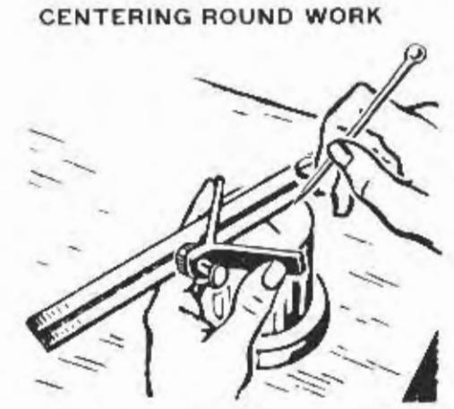 Use the V-shaped center head on the combination square, and encircle the round work with this "V". Scribe a line along the inner edge of the blade. This line will be a diameter of the circular end of the work. Rotate the center head approximately 90° and scribe a second diameter. The center is where the two diameters cross.
