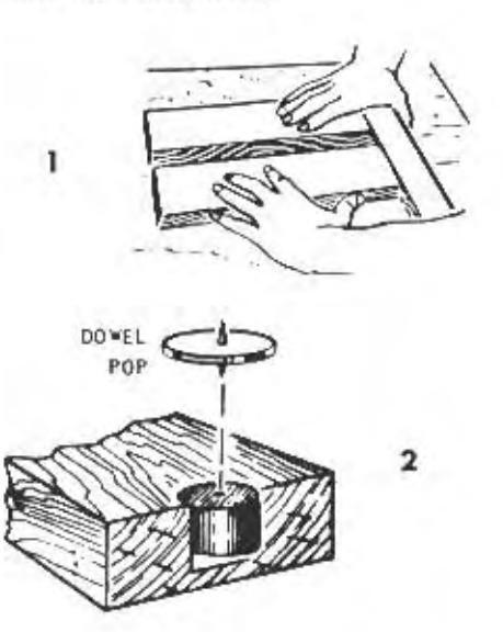 For other types of joints there are two easy methods of locating the dowels accurately. 1) Locate your dowel holes in one workpiece. Take brads and cut off the heads - then insert these (blunt ends down) into this workpiece at the dowel-hole centers. Accurately position the second workpiece against the first, and press them together so that the sharn ends of the brads leave prick points to locate the dowel holes in the second workpiece. Remove the brads - and drill all holes as now marked. 2) The same as "1", except that the first dowel holes are drilled at once - and dowel pops (illustrated) are used in place of brads to locate the second set of dowel holes.