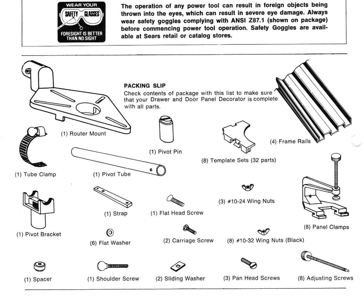The Drawer and Door Panel Decorator (referred to as Panel Decorator) *is a device used with a router to make decorative router cuts on such things as cabinet doors and drawer fronts. Seven sets (four per set) of templates are supplied for making many different designs. An additional blank template set is supplied, which is used to hold wooden templates made by the user.