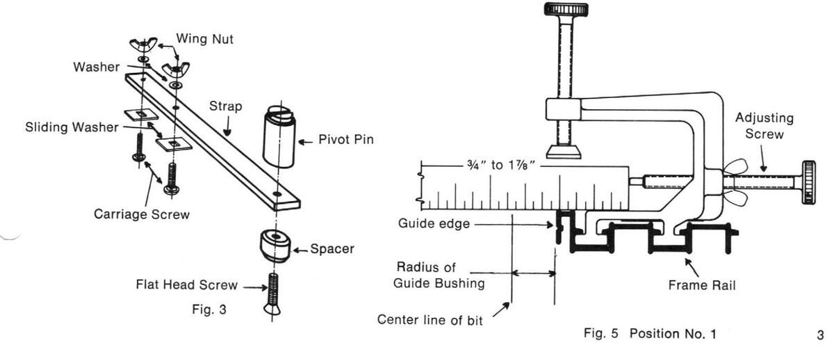 Refer to Figure 5. Each frame rail has two positions into which the panel clamps slide. Using the 5%" diameter guide bushing, the center line of the router bit can be adjusted from 34" to 17%" from the edge of the panel when the panel clamps are in position 1, and from 17%" to 3" when the panel clamps are in position 2. Insert two of the panel clamps into each frame rail. (Small burrs on the ends of the frame rails may prevent the clamps from freely sliding into the rails. The burrs may be removed with a small knife or file.) Determine the desired distance from the edge of the panel that the cut is to be made. Subtract the radius of the guide from this distance and position the adjusting screws as shown. Tighten the wing nuts.