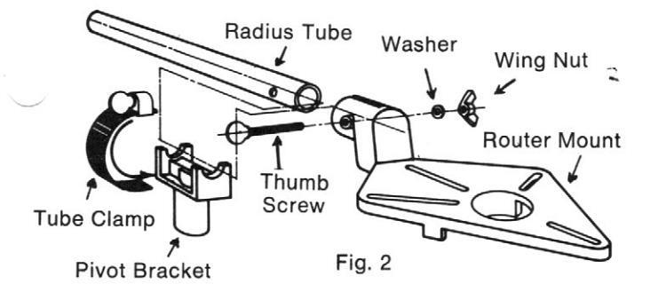 Refer to Figure 2. Insert the radius tube into the router mount making sure that the holes in the tube line up with the holes in the router mount. Insert the thumb screw, washer, and nut as shown. Tighten the nut and screw until the tube is tight in the router mount. Completely open the radius tube clamp. Insert the end of the clamp through the pivot bracket. Partially close the tube clamp. Insert the radius tube through the clamp and pivot bracket. Tighten the clamp such that the radius tube is secured to the pivot bracket in any position for now.