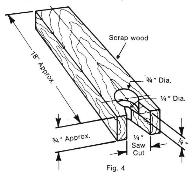 Refer to Figure 4. In order to prevent the panel decorator from moving about when a design is being routed by one person, four wooden clamp blocks will need to be made and used. Using scrap wood, drill and cut the clamp blocks as shown. The use of these blocks will be discussed later.