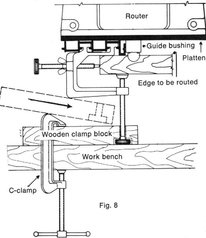 Attach the desired guide bushing to router. Insert the selected router bit through the guide bushing and secure it in the router chuck. Refer to Figure 8. Adjust the router bit such that the end of the bit is extending below the router platen 5%" more than the depth of the cut to be made. Note: This adjustment is for the final cut. If the desired depth of cut is more than 1%", then more than one cut should be made.