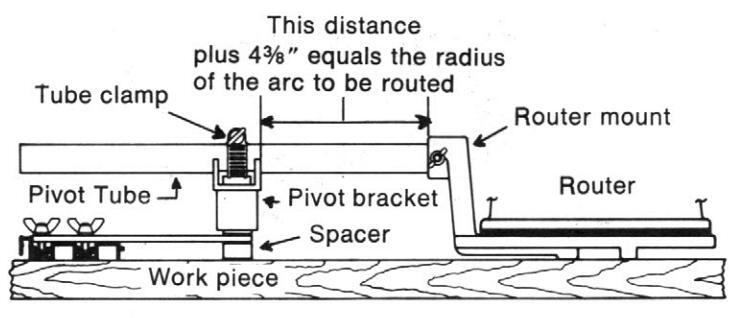 Refer to Figure 12. Slide the pivot bracket over the pivot pin. The router mount should be resting flat on the panel. Loosen the tube clamp and adjust the distance between the pivot bracket and the router mount to obtain the desired radius of the arc to be routed, and retighten the tube clamp. If the arc to be routed blends into a previously routed design, check the beginning and end of the arc to assure that the radius attachment is poistioned correctly. If the arc does not blend into the previously routed design, then minor adjustments will be required for the radius setting, and/or the spacer location.
