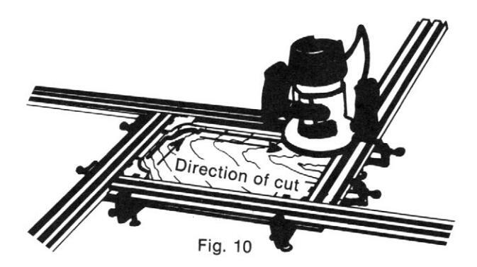 While holding the router such that the bit is slightly above the panel and the guide bushing is against one of the frame rails, turn the router on and allow the motor to come up to full speed. Slowly lower the router until the platen is resting flat on the frame rail. Guide the router through the cut in a right-to-left motion (clockwise) as shown in Figure 10. Maintain a slight amount of pressure on the router to insure that the platen remains flat on the frame rails and the guide bushing is touching the frame rails. Slowly move the guide bushing along the contoured edge of the templates. When the entire design has been routed, turn the router off and allow the motor to come to a complete stop before lifting the router from frame rail. This will prevent the work piece or frame rail from accidently being damaged. The panel may now be removed from the panel decorator for sanding and finishing. Note: If you feel a little practice would be helpful, before putting a bit into the router, set the platen flat on one of the frame rails and move it until the guide bushing is touching the frame rail. Moving in a rightto-left motion, guide the router through the entire design. This will be especially helpful in getting you acquainted with the feel of the router as it is moved along the four frame rails and corner templates.