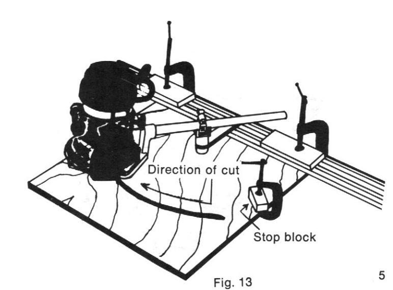 Refer to Figure 13. Stop blocks (scrap wood) should be used at the beginning and end of the arc. Position the router such that the bit is at the beginning of the arc. Place a stop block such that it is touching the side of the router mount. Clamp the stop block to the panel. Repeat for the end of the arc.