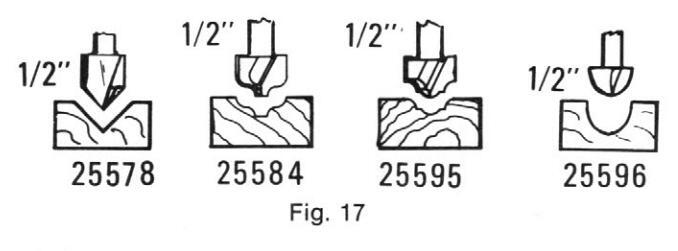 Any of the end cutting router bits may be used with the Panel Decorator. Carbide cutting edges last 15 times longer than high speed steel on abrasive materials such as plywood, chipboard, and Masonite®. Figure 17 shows four bits which are often used with the Panel Decorator.