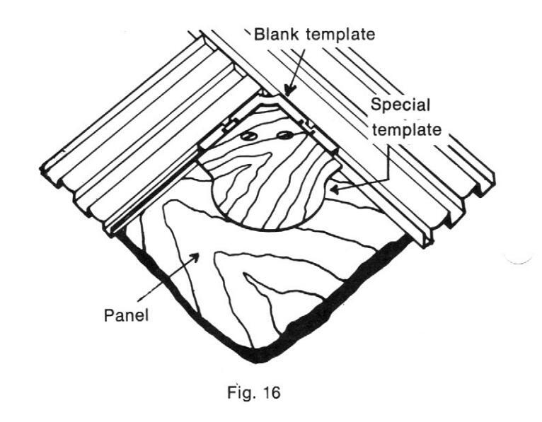 The blank templates may also be used to hold special corner templates made by the user as shown in Figure 16. The special corner templates are to be made from ¼" plywood and mounted to the blank templates as discussed earlier. After snapping the template assemblies into the frame rails, the panel may be routed per earlier instructions.