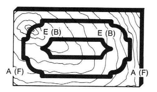 Figures 18 through Figure 27 show examples of some finished panel designs. The letters at the top and bottom of the panel denote which templates were used in making the design. Letters in parentheses denote alternate templates which could have been used to make similar designs.