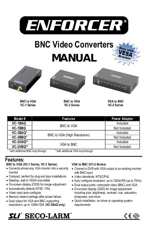 most VGA monitors. SECO-LARM BNC to VGA Converters come in basic and high resolution models.