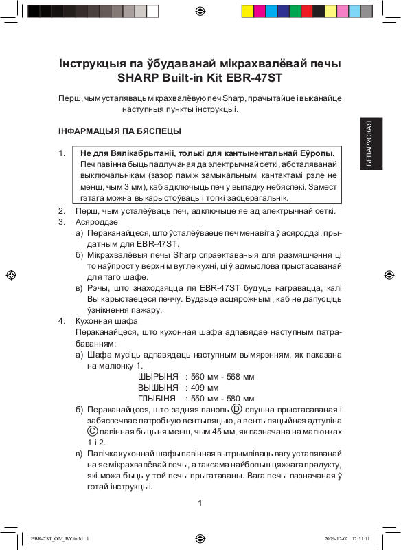 Перш, чым усталяваць мікрахвалёвую печ Sharp, прачытайце і выканайце