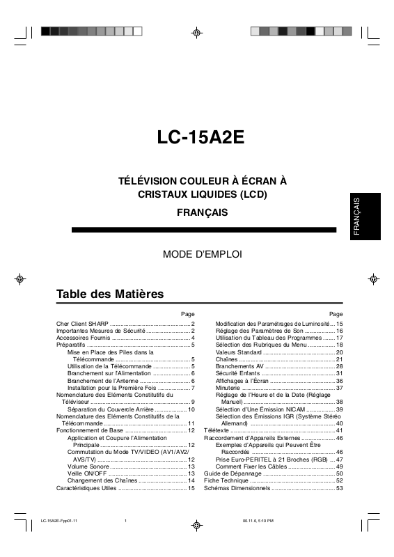 Merci de votre achat du Téléviseur Couleur LCD SHARP. Par mesure de sécurité et afin de garantir