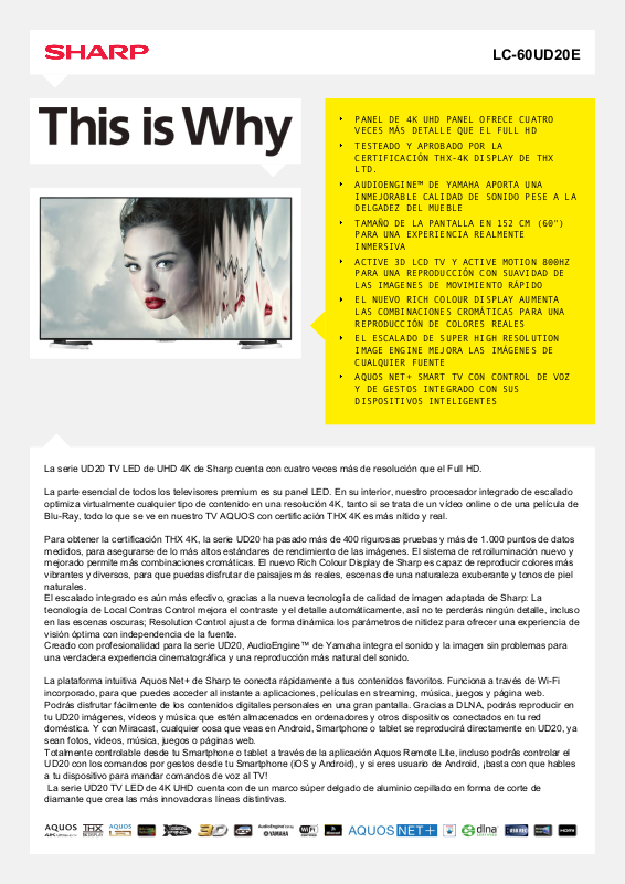 La serie UD20 TV LED de UHD 4K de Sharp cuenta con cuatro veces más de resolución que el Full HD.