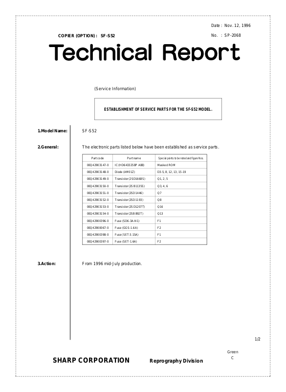 ESTABLISHMENT OF SERVICE PARTS FOR THE SF-S52 MODEL.