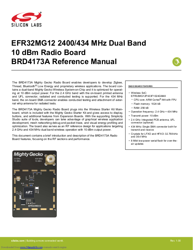 BRD4173A Mighty Gecko Radio Board incorporates an EFR32MG12P433F1024GM48 Wireless System-on-Chip featuring 32-bit