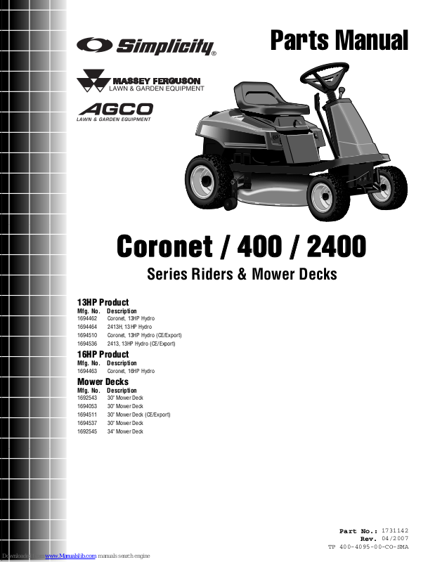 1694462 Coronet, 13HP Hydro 1694464 2413H, 13HP Hydro 1694510 Coronet, 13HP Hydro (CE/Export) 1694536 2413, 13HP Hydro (CE/Export)