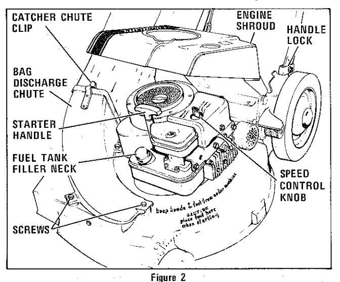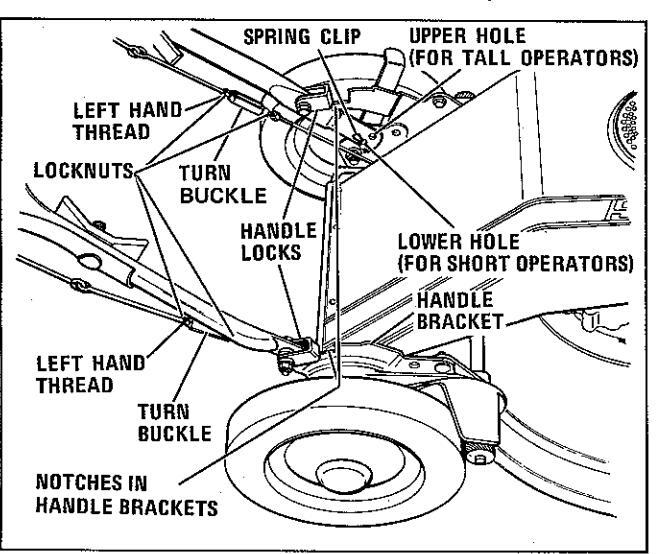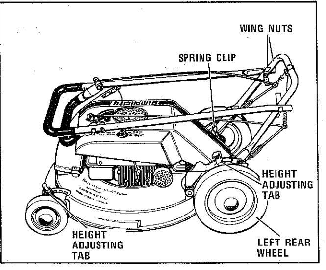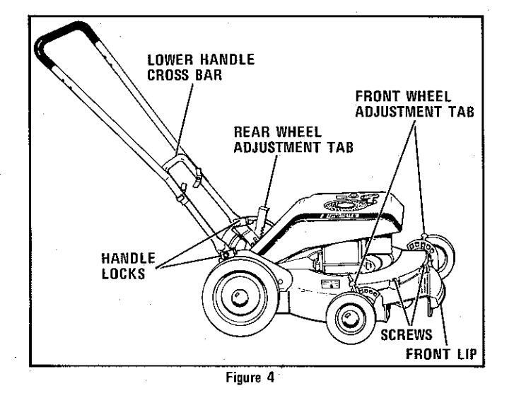 The handle height (in operating position) may be varied to suit different heights of operators. The mower is shipped with the handle in the low position which is most comfortable for persons 5'-8" or less in height.