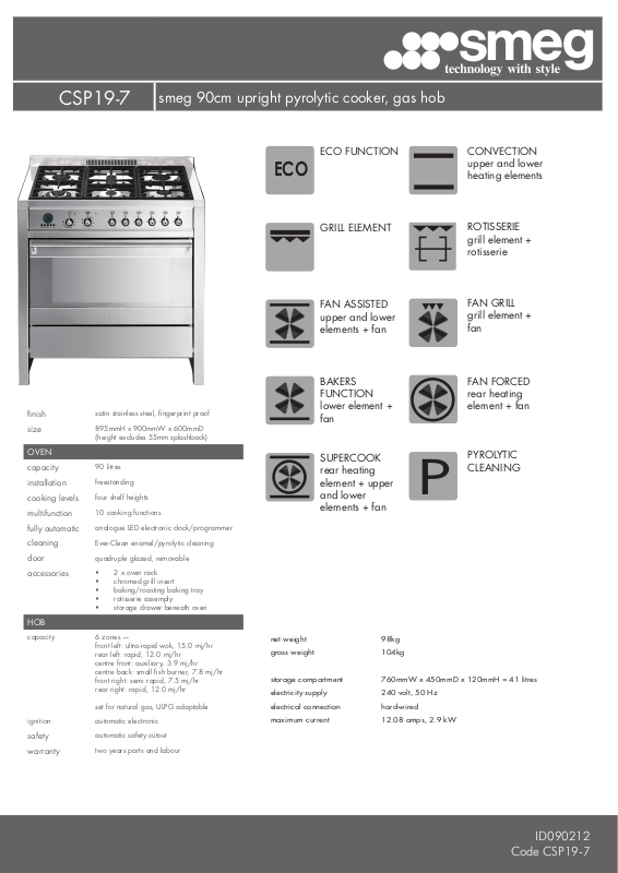smeg 90cm upright pyrolytic cooker, gas hob