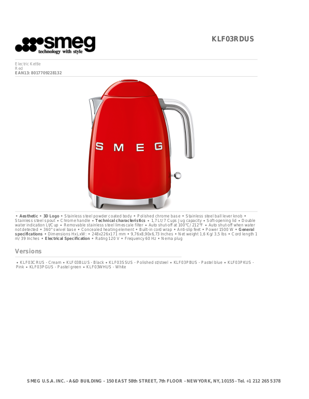 SMEG U.S.A. INC. - A&D BUILDING - 150 EAST 58th STREET, 7th FLOOR - NEW YORK, NY, 10155 - Tel. +1 212 265 5378