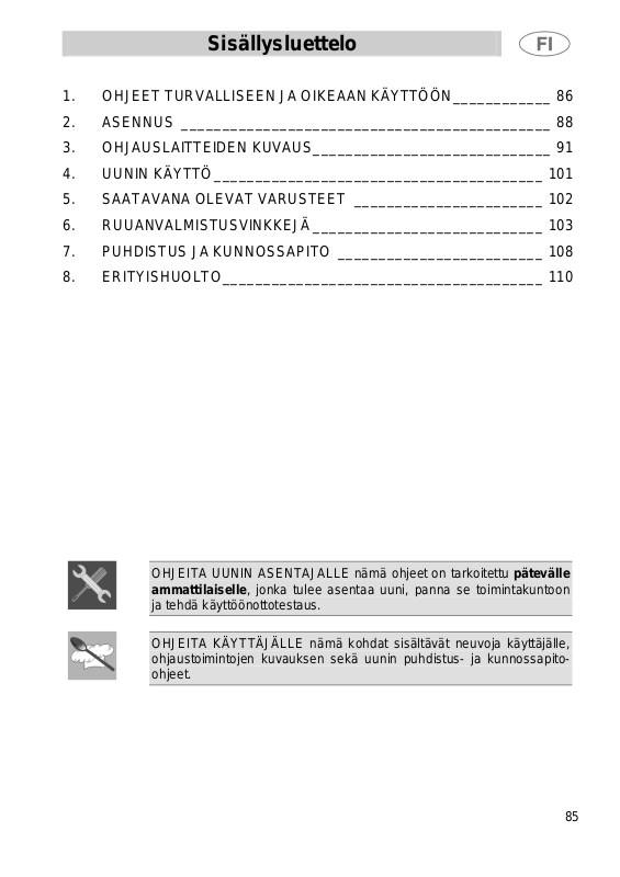 ohjaustoimintojen kuvauksen sekä uunin puhdistus- ja kunnossapitoohjeet.
