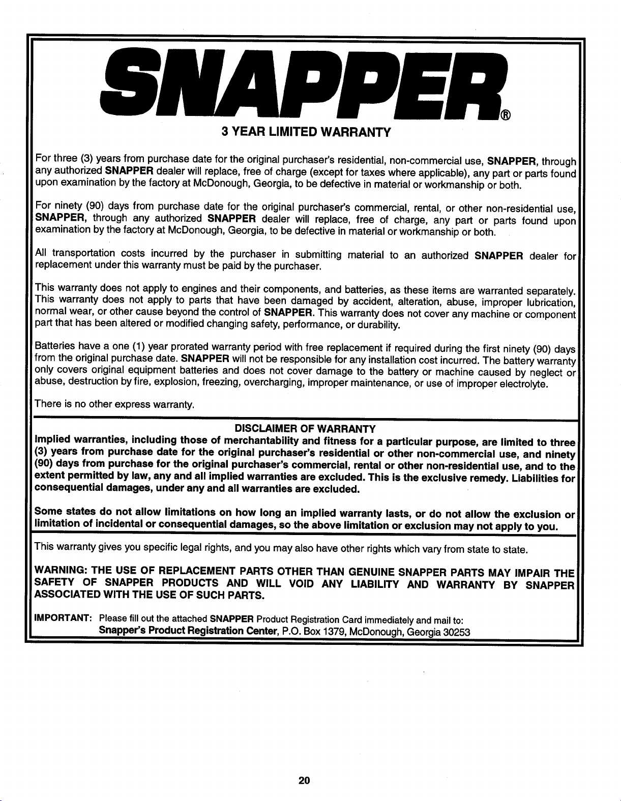 Snapper's Product Registration Center, P.O. Box 1379, McDonough, Georgia 30253