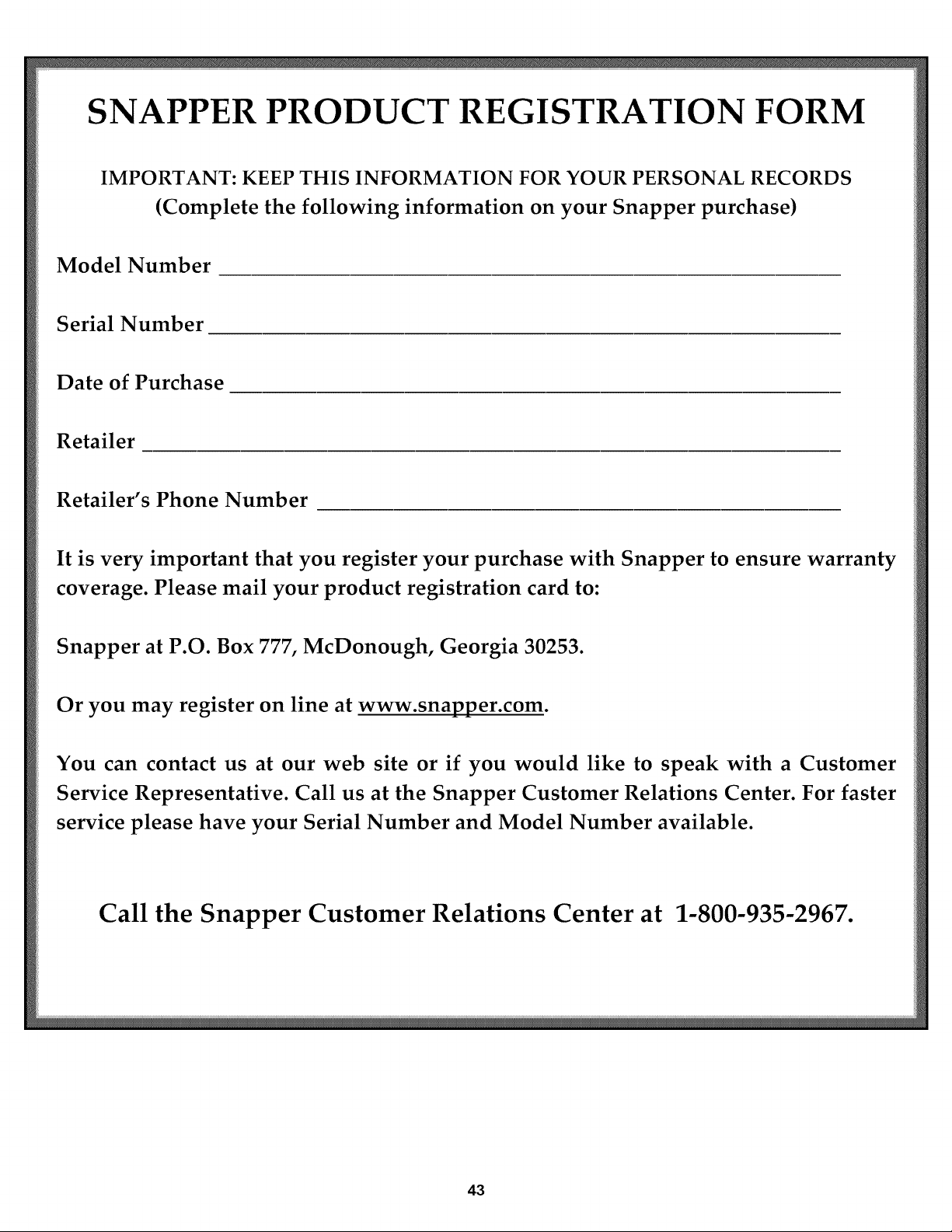 Or you may register on line at www.snapper.com.