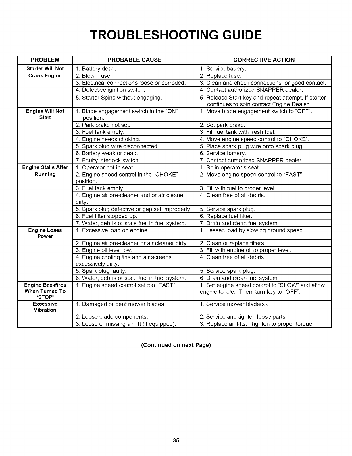 dealer cannot answer to your satisfaction, call or write the Customer Service Department at SNAPPER,