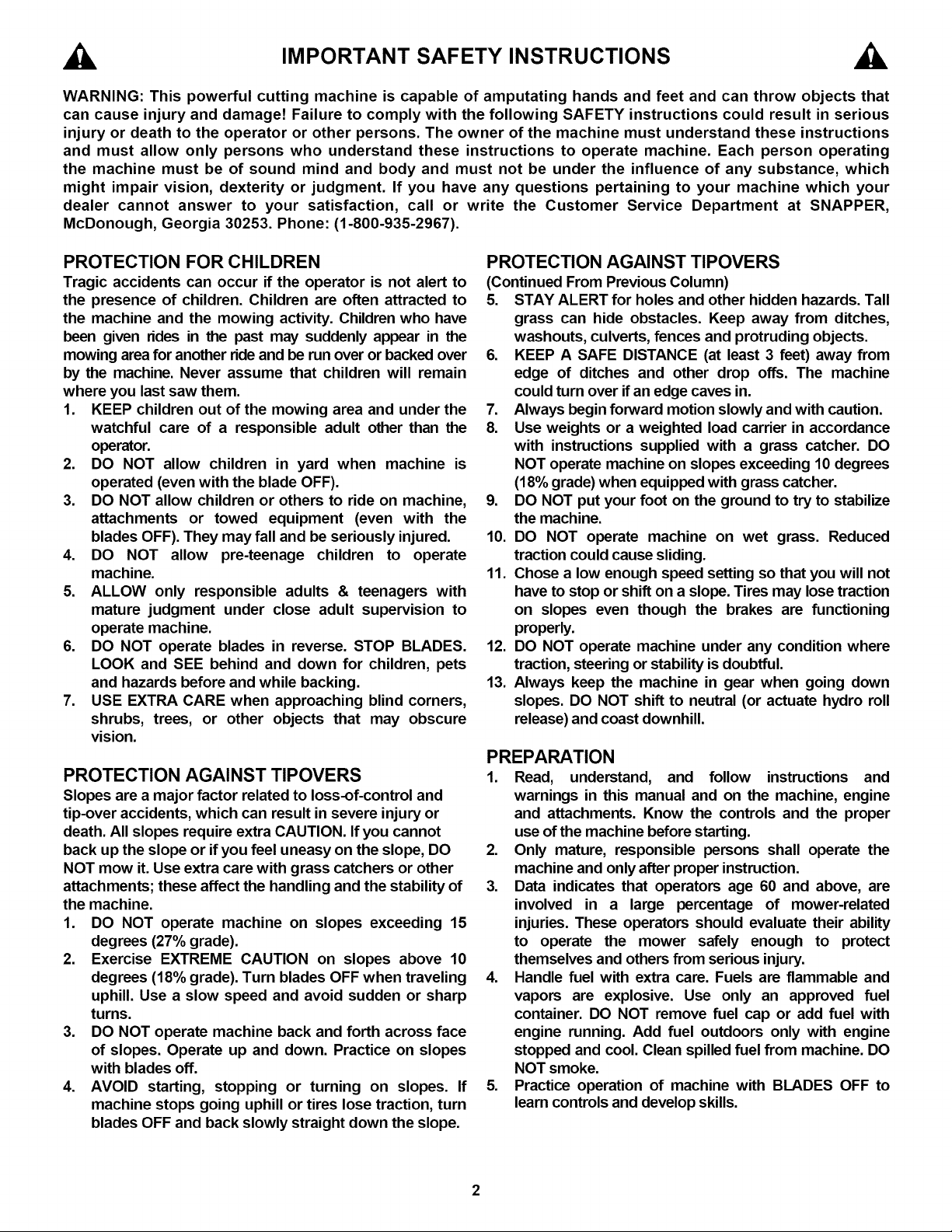 authorized Snapper dealer or contact Snapper Customer Service at Snapper, McDonough, GA. 30253. Phone: (1-